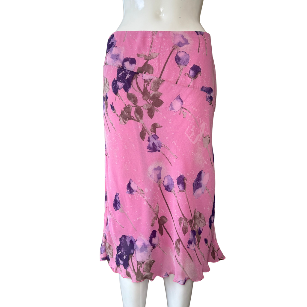 Blugirl by Blumarine midi skirt in pink with purple flowers. Features lettuce hem.